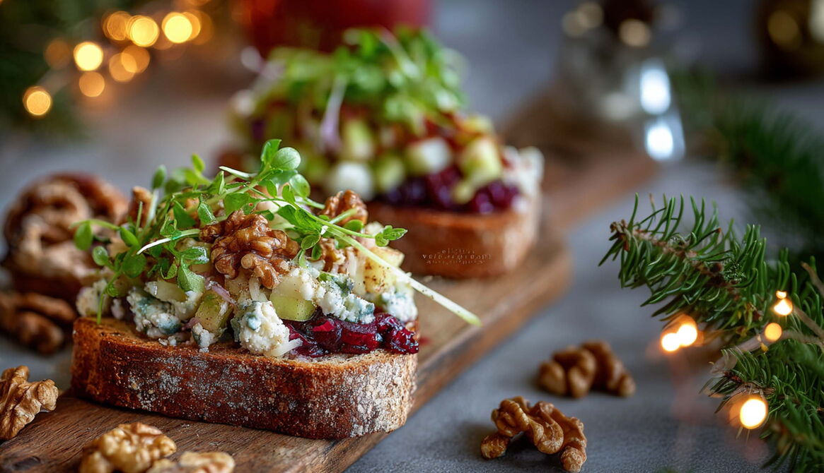 Jeden Monat stellen wir eine Idee zusammen, die saisonale Zutaten und vertraute Aromen vom Markt kombiniert. Für den Dezember wird’s festlich und aromatisch: Wie wäre es mit Sauerteigbrot und einem winterlichen Bratapfel-Relish, kombiniert mit geräuchertem Saibling oder cremigem Blauschimmelkäse? Knackige Walnüsse und frische Kresse bringen Textur und Frische ins Spiel.